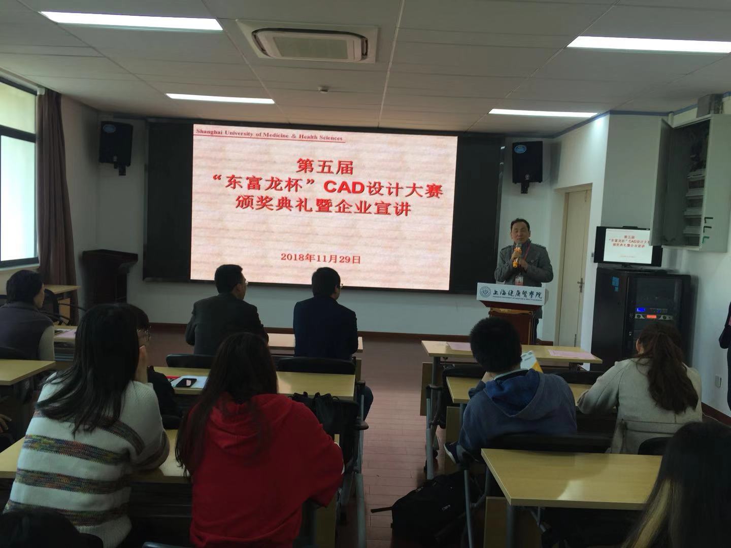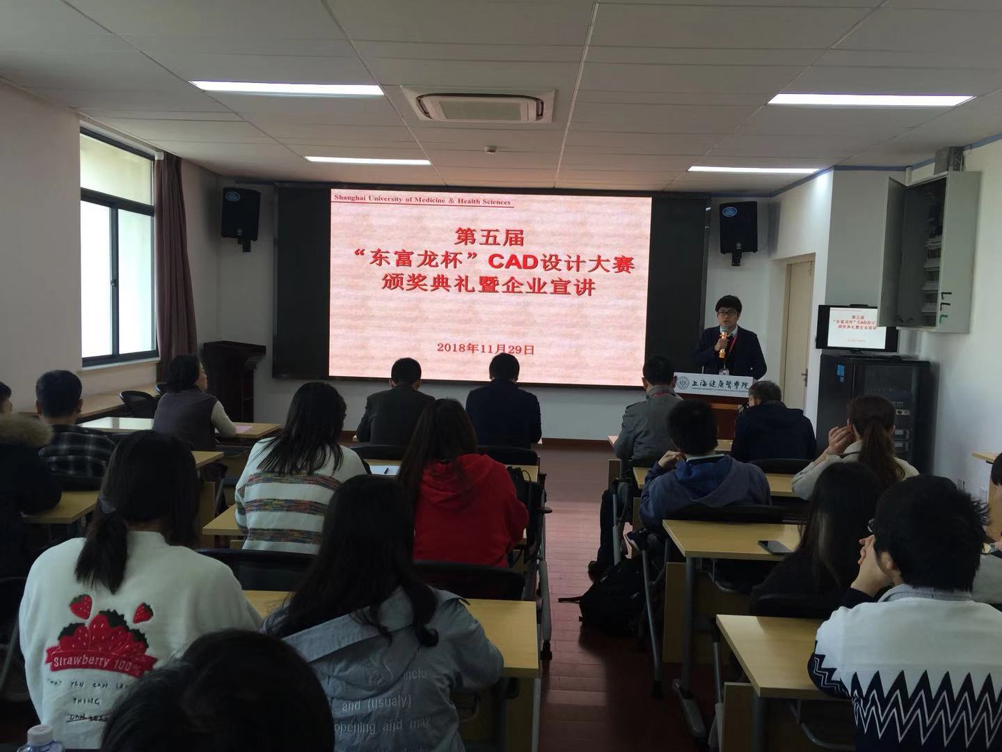 2018年11月29日, 第五届“东富龙杯”CAD创新设计大赛颁奖典礼在医疗器械学院410会议室举行。出席会议的有:上海东富龙集团公司人力资源部经理顾为祥、上海东富龙科技股份有限公司人力资源部主任及培训科负责人焦化雨、上海健康医学院医疗器械学院党总支书记王云光、学院副院长孙丽萍、学院副书记吕杰,颁奖典礼由吕杰副书记主持。