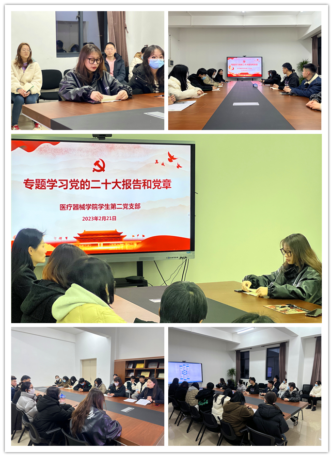 2023年2月21日18:00,医疗器械学院学生第二党支部组织全体支部党员专题学习党的二十大报告和党章,确保学习教育全覆盖,切实增强开好组织生活会的思想自觉、政治自觉和行动自觉。
