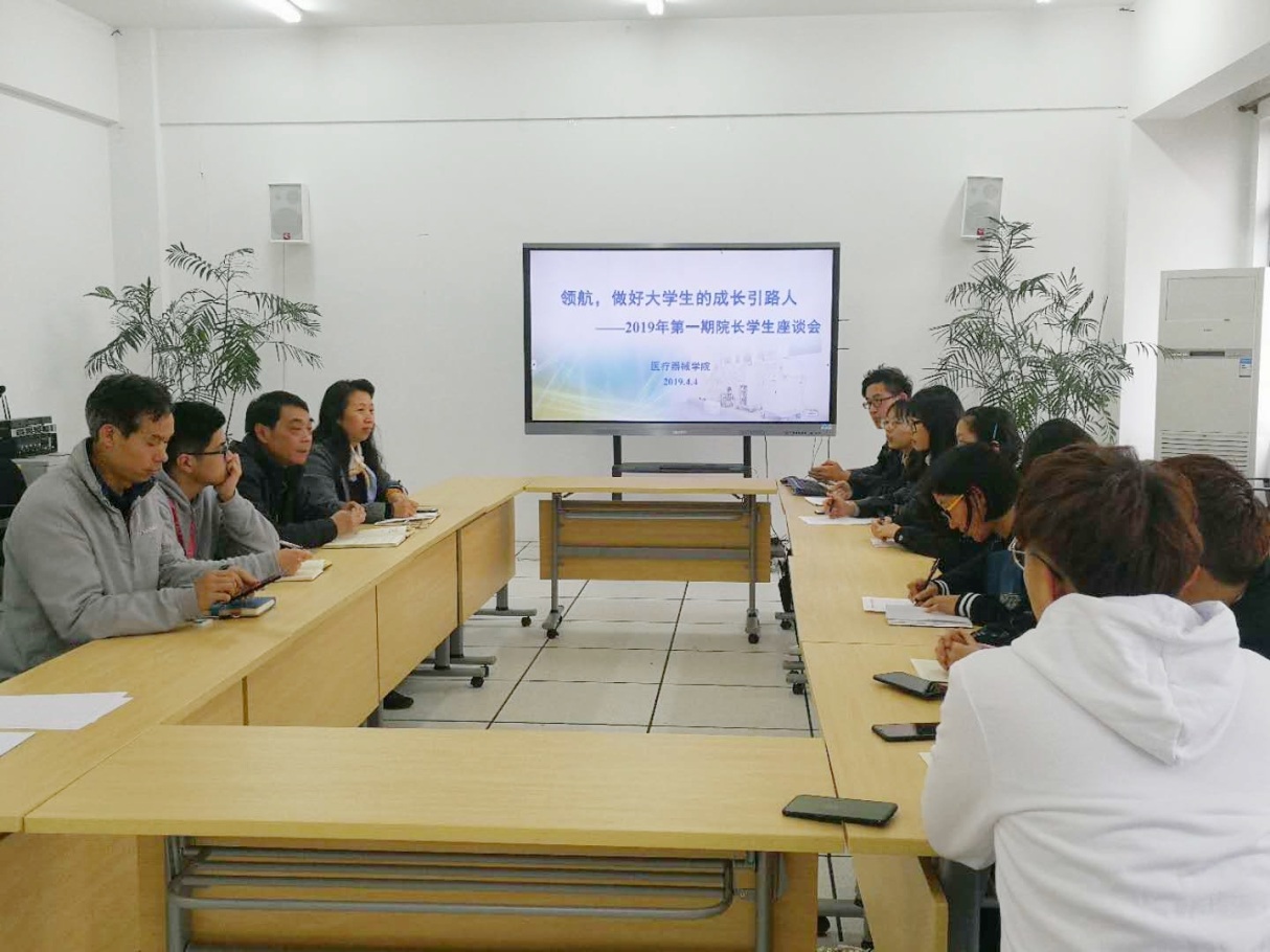 2019年4月4日下午, 医疗器械学院在18号楼506举办2019年第一期院长与学生面对面的座谈会,旨在全面了解学生的学习生活状况,听取学生的意见建议,引导学生更好地成长成才,同时让学生更深入地了解学院专业相关情况,明晰学业的发展轨迹。医疗器械学院院长胡兆燕、副院长张欣、党总支副书记吕杰、专业主任蒋海洪以及18级的本科专业十多名学生代表参加了此次会议。