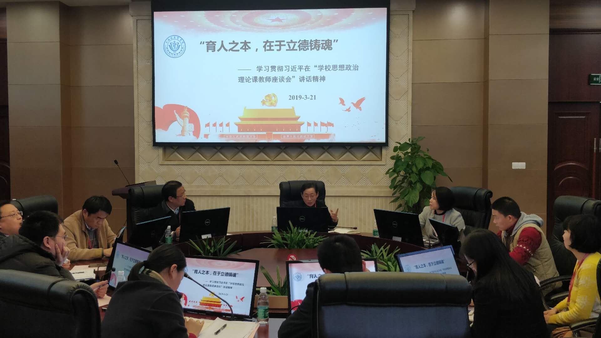 2019年3月21日,校党委书记郑沈芳与马克思主义学院全体思政课教师在北苑1号楼110室召开交流研讨会,集体学习贯彻习近平在学校思政理论政治课教师座谈会上的讲话精神。宣传部、人事处(党委教师工作部)、教务处、学生处等相关部门负责人以及部分辅导员老师参加了交流研讨。会议由马克思主义学院院长孙玉良主持。