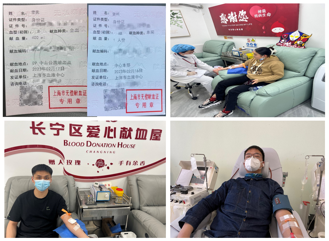 血液是生命的源泉,是传递社会爱心的红色纽带。师生用爱心接力,铺就生命之路,希望以自己的方式送给小蒋同学最温暖的礼物。陈琼说:“小蒋是我专科时一起升本的同学,认识时间很长,但是我也不知道他生病了。当我得知他的紧急病情,并且需要我们的帮助,我毫不犹豫地挽起袖子献出自己的热血,虽有点紧张,但是想着从自己体内流出的血液代表着生的希望,他便忘记了恐惧。”雷昊说:“当我得知小蒋的病情我正在医院上班,我知道他身体不舒服一直吃药,没想到这次这么严重,了解到详细情况之后,看到血检数值那么低很担心,心中没有丝毫犹豫,立马预约到最近的献血站,‘予人玫瑰,手有余香’,希望尽我最大的能力给予他帮助是很开心的一件事。谢柯说:“当我得知蒋同学的情况后我立马采取行动,一开始对献血的互助政策不了解,先去了周浦献血站咨询,那边区属献血站不支持这个政策,然后打电话给了市属献血站,可以用互助政策。离学校最近的是华泾献血站,因为我距离上次献血不满6个月,不能献全血,工作人员说可以献血小板,我预约了第二天2.16血液中心献血小板,由衷感到能够奉献自己微不足道的一点力量而挽救一个生命感到光荣!”