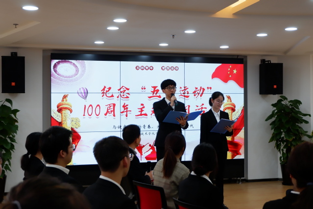 医学技术学院学生党支部书记胡长沙老师介绍了活动的背景及流程。活动分为“缅怀革命先烈”、“弘扬五四精神”、“争做爱国青年”三个篇章。第一篇章“缅怀革命先烈”用视频展现百年前那段令人热血沸腾的历史。18级医学检验技术本科1班姜琛菲等10名同学带来一段《先烈们的故事》,重温激情岁月,感悟爱国主义精神;第二篇章“弘扬五四精神”,16级医学检验本科1班的戴佳怡、沈嘉吉、陈铭三位同学讲述了创建上海市“五四”红旗团支部的故事---从“细胞红”、“组织红”到“基因红”,红色作为一种底色融入每一位“最美检验人”。刚刚荣获“2018年度上海市教卫工作党委系统十佳好人好事”的傅向东老师讲述青年与志愿精神。傅老师指出当今青年投入志愿活动正是弘扬和践行“五四”精神的具体体现。作为健康人,应该在志愿活动中为国筑梦;第三篇章“争当爱国青年”。学生党员代表张如意同学发言,青年要有担当,为理想竭力奋斗,在奋斗中成就青春,为民族复兴梦添砖加瓦。随后党支部委员胡长沙、郭子叶、杨晓丽、杨宇海老师为入党积极分子、发展对象和学生党员进行“亮身份,明职责”挂牌仪式并进行青年宣誓。
