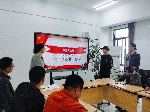 首先,殷音同志向大家介绍中华人民共和国国歌《义勇军进行曲》的创作经历和历史背景,并带领全体党员奏唱国歌。之后,叶剑辉老师补充了2017年国歌立法的相关知识,并要求大家以敬仰的态度对待“中国第一声音”。接下来,陈昳皓、张家昕、梁科等九位同学向大家介绍了《歌唱祖国》、《游击队之歌》及《黄河大合唱》第七乐章《保卫黄河》这三首经典歌曲,他们声情并茂地介绍了歌曲相关的创作背景、曾演唱的场合等,并带领与会党员合唱这三首歌曲。虽然同志们的歌喉略显朴素,但是他们深情的歌声,有力的歌词感染着整个会场。