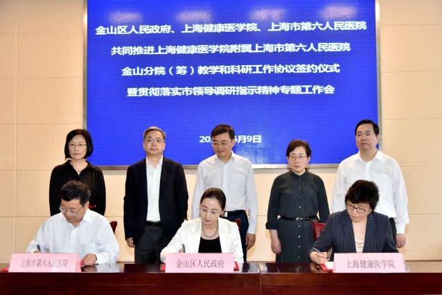 6月9日上午,正值端午假期,金山区人民政府、上海健康医学院、上海市第六人民医院共同推进上海健康医学院附属金山分院(筹)教学和科研工作协议签约仪式暨贯彻落实市领导调研指示精神专题工作会在金山分院会议厅举行,中共金山区区委书记赵卫星、区人民政府副区长张娣芳;上海健康医学院党委书记郑沈芳、党委副书记于莹、相关职能处室负责人;上海市第六人民医院党委书记陈方、院长殷善开、副院长陶敏芳;区委办公室主任邱运理;区卫健工作党委书记孙群荣,金山区卫健委主任吴靖平以及金山分院领导班子全体成员出席会议。会议由孙群荣书记主持。