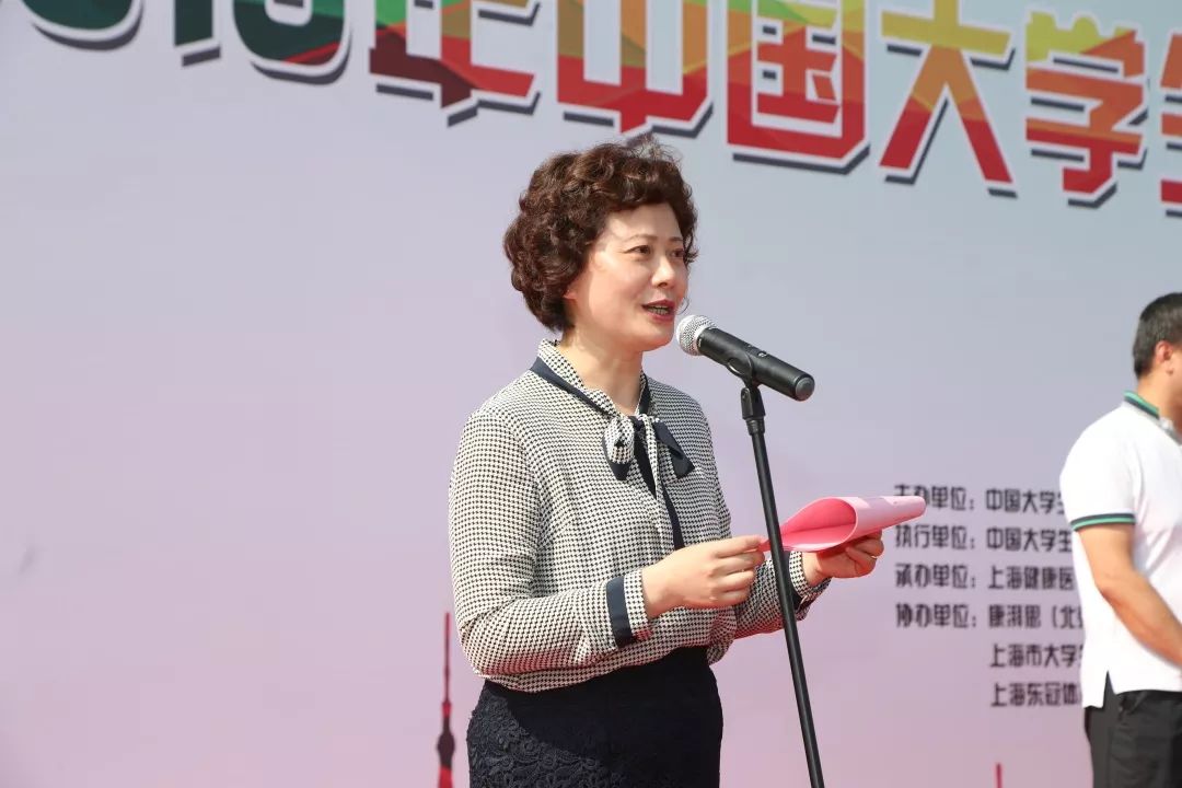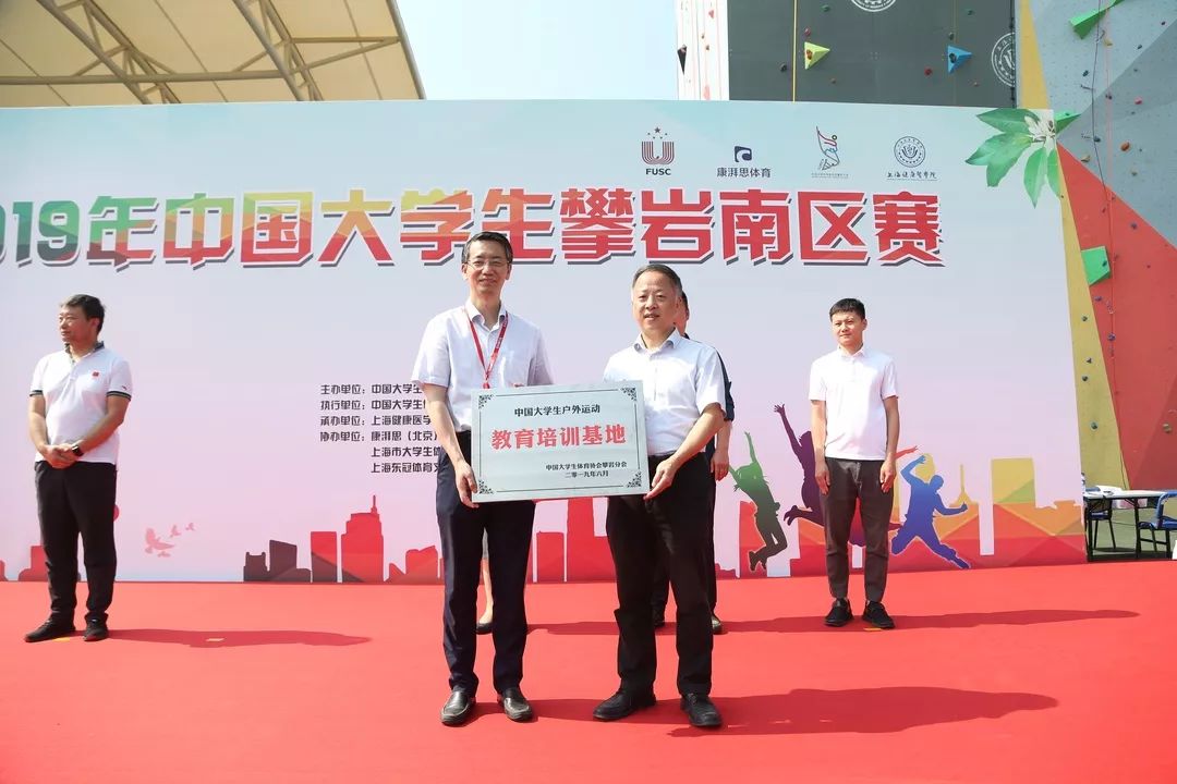 中国大学生体育协会副主席、攀岩分会主席、东华大学党委副书记金海燕致辞中介绍到,攀岩项目经过多年的发展,高校已经成为我国攀岩项目发展的主力阵地,吸引越来越来多大学生群体加入到这项运动。此次,中国大学生攀岩南区赛将是广大学生朋友们的一次攀岩盛会,更是一次对自我的挑战和超越!在这个挑战极限、超越自我的平台上,相互学习,增进友谊。随后,由金海燕代表中国大学生体育协会授予上海健康医学院为中国大学生户外运动教育培训基地,上海健康医学院在户外运动发展上,已形成独具一格的办学特色,在“硬件”的建设和“软件”的开发上实现了较高的目标,学校希望借助出色的软硬件条件为中国校园户外运动的发展贡献一份力量。
