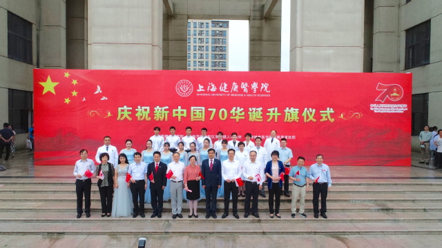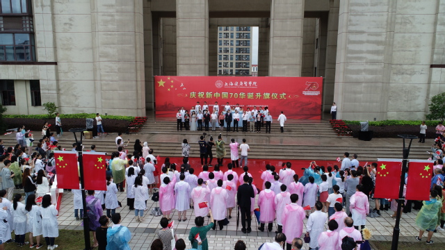 10月1日,上海健康医学院联合周浦镇人民政府、附属周浦医院在学校南苑广场共同举行庆祝新中国成立70周年升旗仪式,这既是一次深刻的爱国主义教育,也是共同开展 “不忘初心、牢记使命”主题教育的重要内容,全体校领导、全体中层干部、师生代表、周浦镇党政班子全体成员、附属周浦医院全体领导及职工代表、社区居民及教师家属等500余人在雨中举行升旗仪式,齐唱国歌,表达对伟大祖国的忠诚与祝福。校党委宣传部部长李兆伟主持升旗仪式。