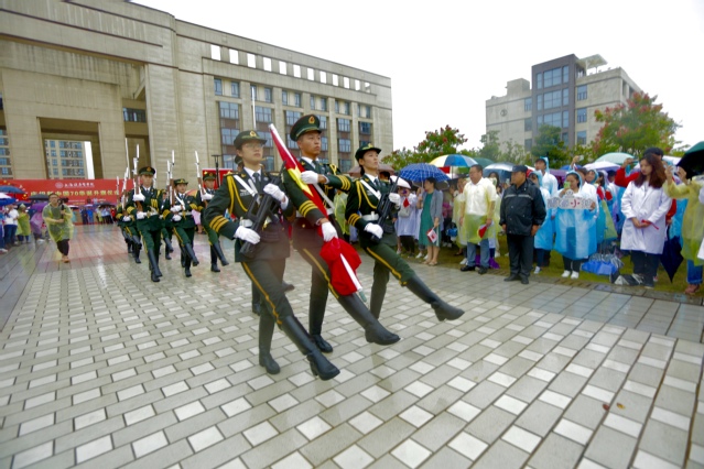 7时45分,上健医师生和周浦镇社区居民在风雨中齐聚国旗下,静候升旗仪式开始。7时55分,在全体师生和居民的见证下,国旗仪仗队手执护卫着五星红旗,步伐整齐划一地走向升旗台。8时整,在雄壮的《义勇军进行曲》旋律中,五星红旗冉冉升起。整个仪式过程中风雨交加,却无法浇熄上健医师生火一般热烈的爱国情怀,师生和居民面向国旗行注目礼,在雨中齐唱国歌,场面庄重,令人动容。