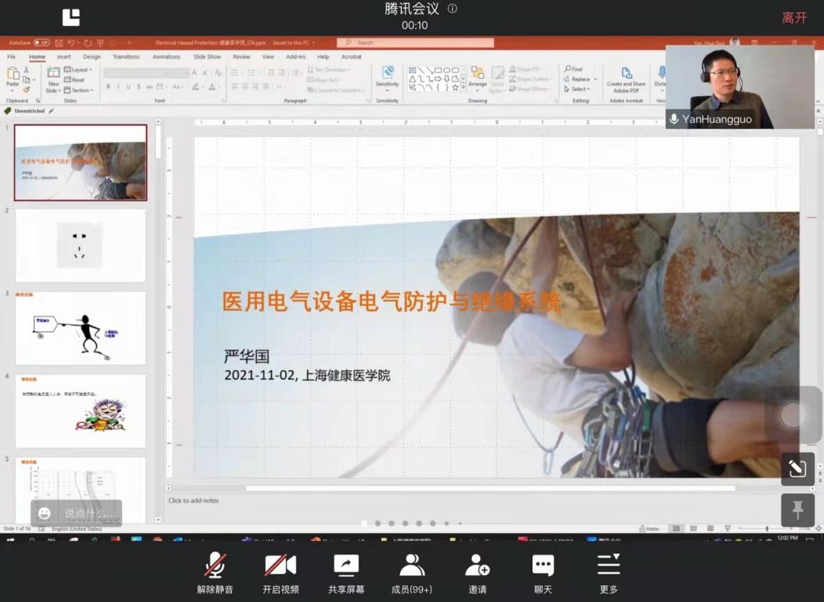 2021年11月4日,由上海健康医学院医疗器械学院政策研究与安全评价中心举办的“2021人类命运共同体携手应对挑战”系列云端论坛第26讲如期举行。本期论坛特邀嘉宾是西门子医疗检测事务总监严华国先生,他同时担任IEC TC62/SC62A/WG14技术专家委员等职务,同时他也是医疗产品管理专业校外班导师。他为我们带来了题为“医用电气设备电气防护与绝缘系统”的主题报告。