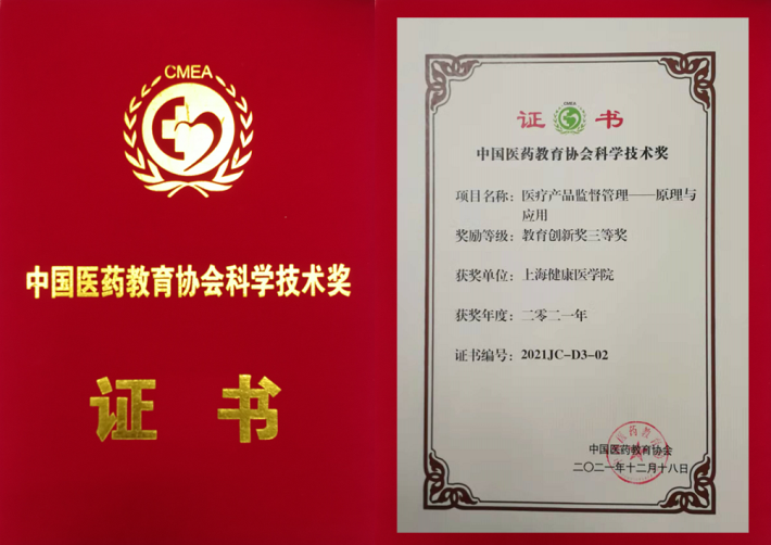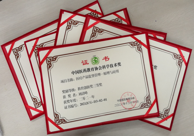 我校医疗器械学院刘清峰教授领衔申报的科研成果《医疗产品监督管理:原理与应用》荣获中国医药教育协会2021年科学技术奖三等奖
