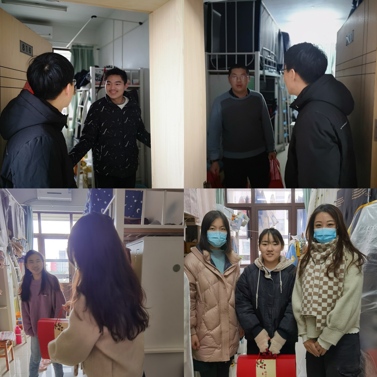 2022年1月29日下午,医疗器械学院党总支书记李晓欧、党总支副书记吕杰与学院专职辅导员刘一丹、祝奇一同走访了南苑和新南苑学生宿舍,看望慰问寒假留校学生,代表学院向学生表达春节问候。
