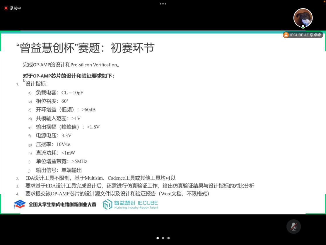 全国大学生集成电路创新创业大赛分为三个阶段:初赛、分赛区、决赛。在初赛阶段,参赛者需要在EDA工具中完成指定参数指标的OP-AMP芯片的设计并完成Pre-silicon Verification工作,根据提交的芯片设计和设计验证报告评分晋级分赛区决赛。