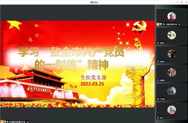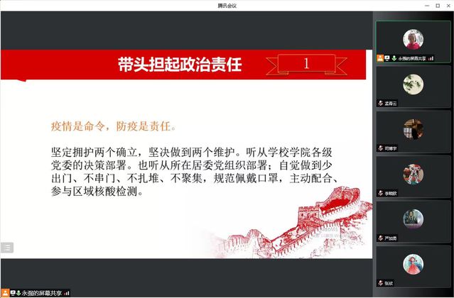 陈永强带领全体与会党员学习了《在大战大考中彰显特殊责任、特殊担当——致全市共产党员的一封信》,号召支部党员要带头担起政治责任,要带头发挥党员作用,要带头联系服务群众,越是特殊时期,越要扛起特殊责任、拿出特殊担当,咬紧牙关、一鼓作气,坚决打赢疫情防控这场大仗硬仗。会上,学院书记李晓欧强调,要深入贯彻习近平总书记重要讲话和指示批示精神,坚决落实和积极响应上海市委市政府的各项决策部署和号召,迎难而上、尽锐出战,全力筑牢防疫抗疫战斗堡垒。各位党员也纷纷表示,我们都会做好本职工作的同时,在疫情需要的地方勇担使命。一方面教育教学、关爱学生。有困难也会克服,与奋斗在学校第一线的各位老师,并肩作战,保质保量完成学校和学院布置的各项工作。另一方面,会在生活社区做好党员先锋带头作用,助力所在区域防疫,共克时艰。