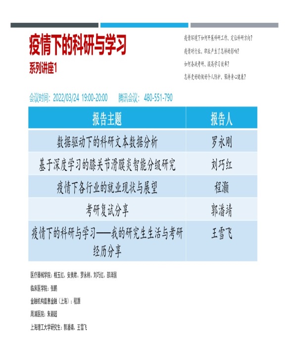 近期,上海疫情防控进入最关键阶段,为了促进学生更好地在校学习、生活甚至与老师开展科研工作,信息教研室刘巧红、邵泽国两位老师倡议围绕“疫情下的科研与学习”主题开展系列讲座。3月24日晚,首次讲座在腾讯会议室开讲,此次讲座特别邀请医疗器械学院相玉红教授、临床医学院张鹏副教授、普惠金融总经理程灏博士、周浦医院护理部朱颖超老师开讲,教研室安美君老师、罗永刚老师、学院本科生以及上海理工大学和上海中医药大学的研究生等累计95人参加了讲座。