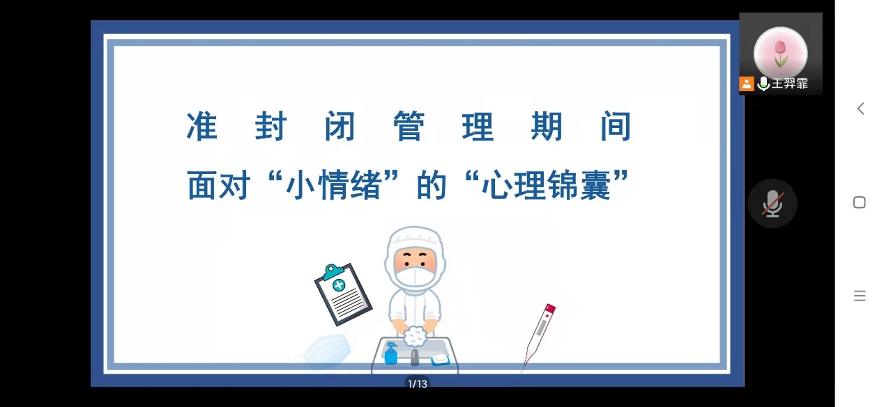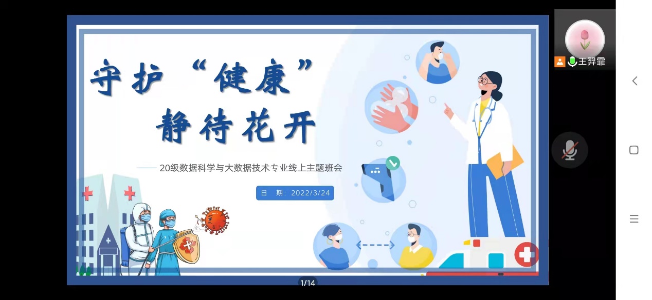 辅导员心连心——积极心理学视角下的守护“健康”,静待花开主题班会。结合学校疫情防控政策要求,引导学生科学认识疫情防控形势,坚定信心,统一行动。以战疫一线榜样事迹为例开展思政教育,培养同学们心怀感恩,感悟奉献精神,强化责任意识。同时引导同学们敞开心扉交流,相互支持,疏导情绪,携手同行。