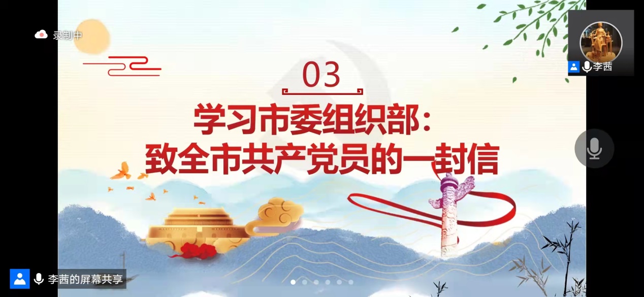 3月24日,中共上海市委组织部发布了《在大战大考中彰显特殊责任、特殊担当——致全市共产党员的一封信》,学生第一党支部及时积极组织支部党员认真学习这封信的精神内涵,并结合当前严峻的疫情防控形势背景,立足自身发挥先锋模范作用情况开展心得交流。