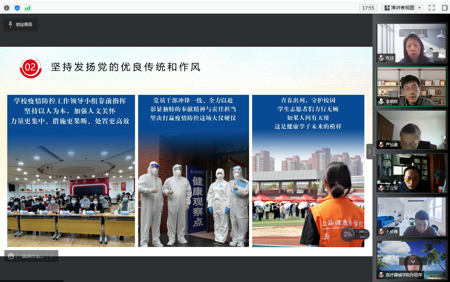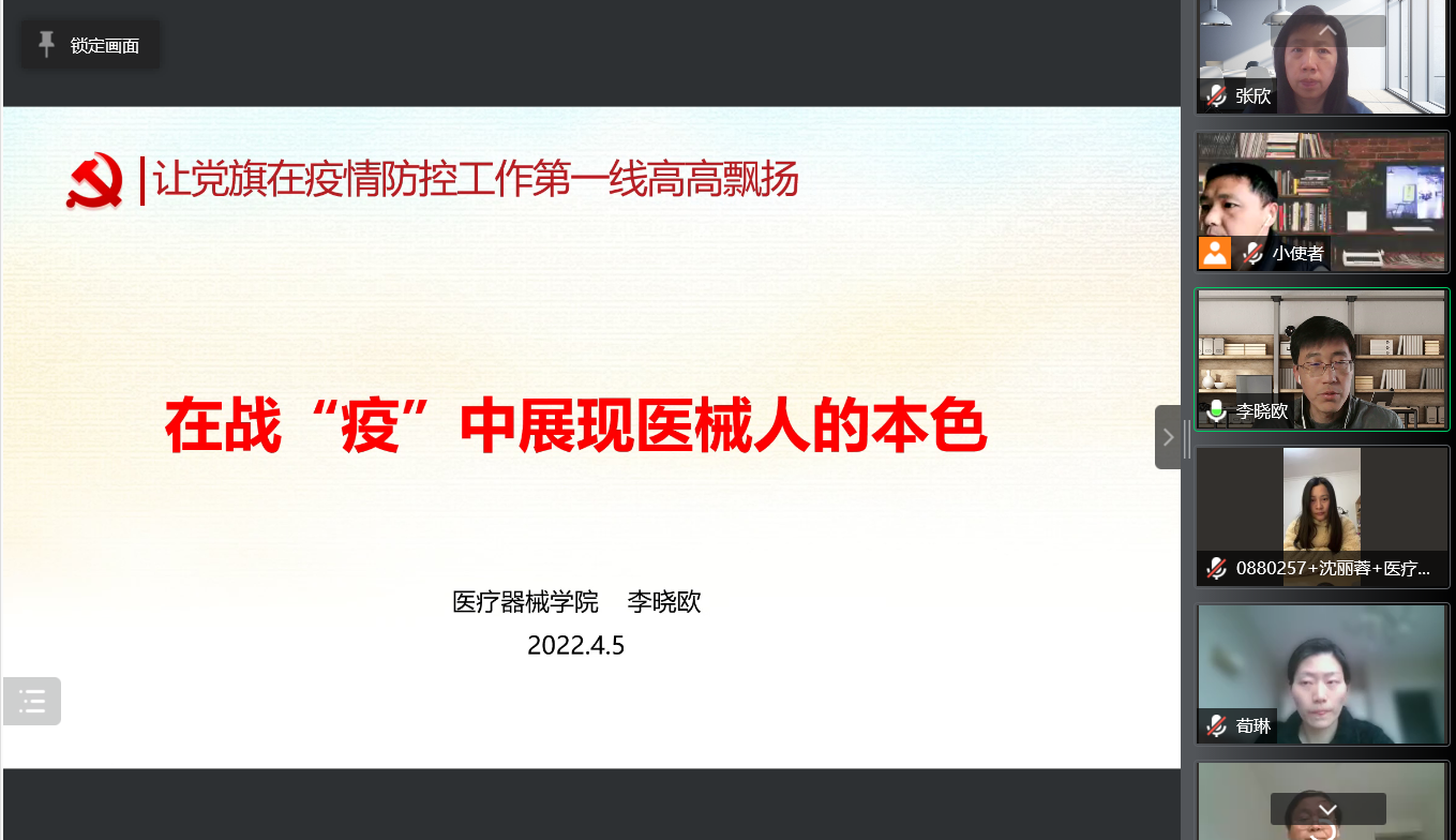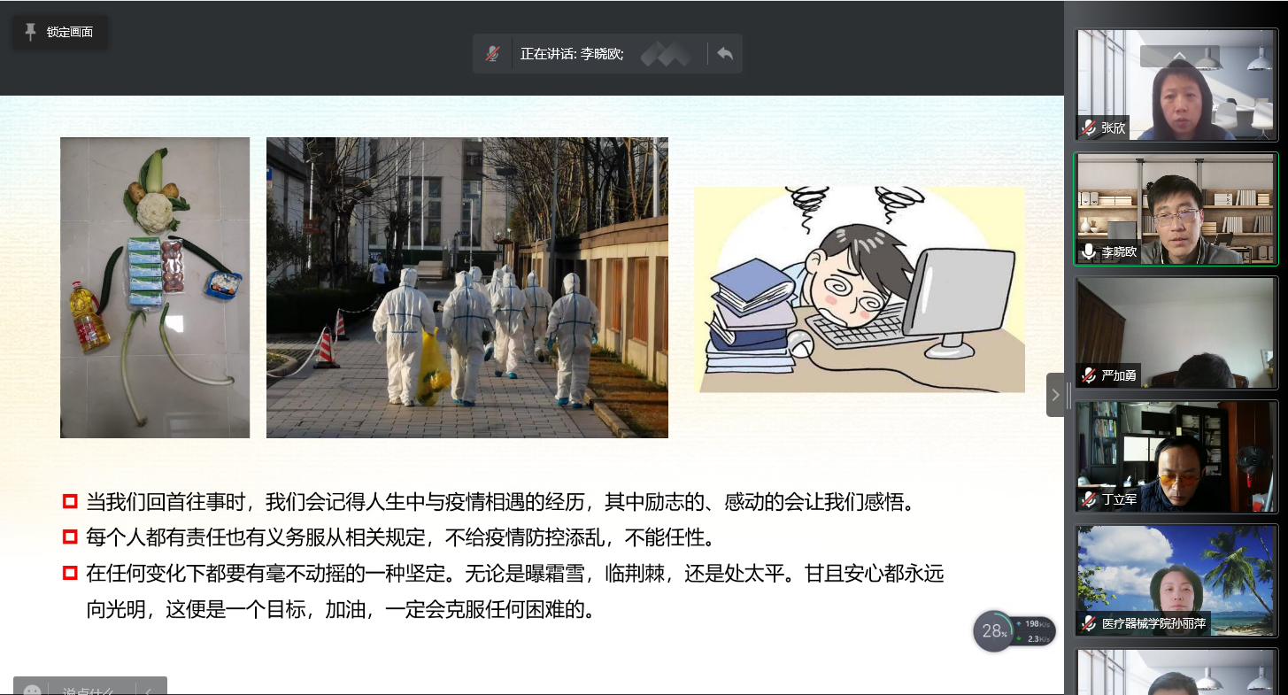 4月5日上午,医疗器械学院党总支通过腾讯会议平台召开中心组(扩大)学习会议,学院党总支委员、各党支部书记及委员、团总支书记、教研室主任、科级干部、工会主席等参加了会议,学院党总支李晓欧书记从“始终牢记初心使命”、“坚持发扬党的优良传统和作风”、“不断提升特殊时期的工作本领和能力”三个方面讲专题党课《在战“疫”中展现医械人的本色》。