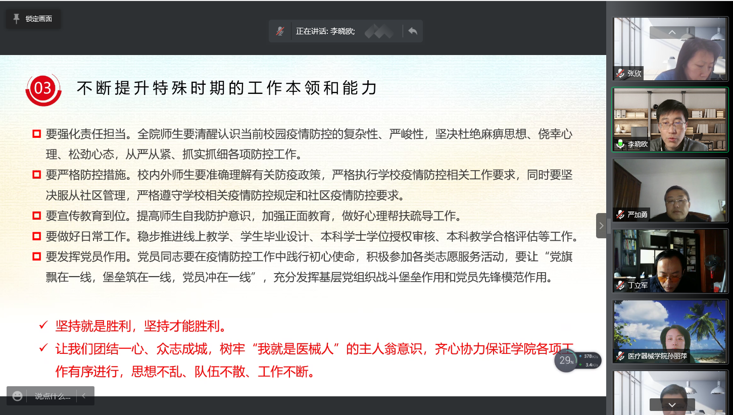 在“不断提升特殊时期的工作本领和能力”部分,李晓欧书记强调,突如其来的疫情,考验的不仅是党员干部的初心和使命、作风和意志,更是本领和能力,要求全体党员“要强化责任担当,清醒认识当前校园疫情防控的复杂性、严峻性,坚决杜绝麻痹思想、侥幸心理、松劲心态,从严从紧、抓实抓细各项防控工作”、“要严格防控措施,准确理解有关防疫政策,严格执行学校疫情防控相关工作要求,同时要坚决服从社区管理,严格遵守学校相关疫情防控规定和社区疫情防控要求”、“要宣传教育到位,提高师生自我防护意识,加强正面教育,做好心理帮扶疏导工作”、“要做好日常工作,稳步推进线上教学、学生毕业设计、本科学士学位授权审核、本科教学合格评估等工作”、“要发挥党员作用,党员同志要在疫情防控工作中践行初心使命,积极参加各类志愿服务活动,要让‘党旗飘在一线,堡垒筑在一线,党员冲在一线’,充分发挥基层党组织战斗堡垒作用和党员先锋模范作用”,树牢“我就是医械人”的主人翁意识,齐心协力保证学院各项工作有序进行,思想不乱、队伍不散、工作不断。