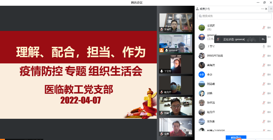 2022年4月7日,医临教工党支部召开疫情防控专题组织生活会,医临教工支部全体党员参加了会议,会议由支部书记卜庆锋主持。