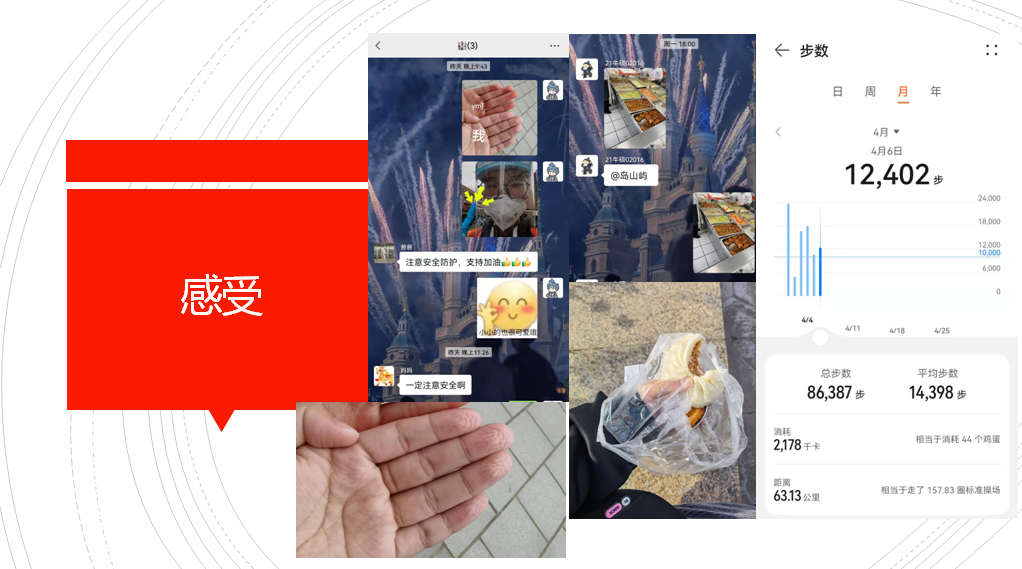讨论环节,刘宇通、赫英臣、郑艳芳、陈晓月、张笑、高浩天等6位同学分别分享了自己在餐饮组、核酸组、卫生组、机动组、快递组等学校志愿者岗位上的工作经历和感受,尤其是赫英臣同学图文并茂地介绍了自己作为核酸组小组长的工作经历,队伍引导、信息核计、核酸岗位置、汗水湿透的衣服、发白起皱的双手等照片全面展现了上健医学子在抗疫中的奋斗与风采,折射出上健医学子的责任与担当。