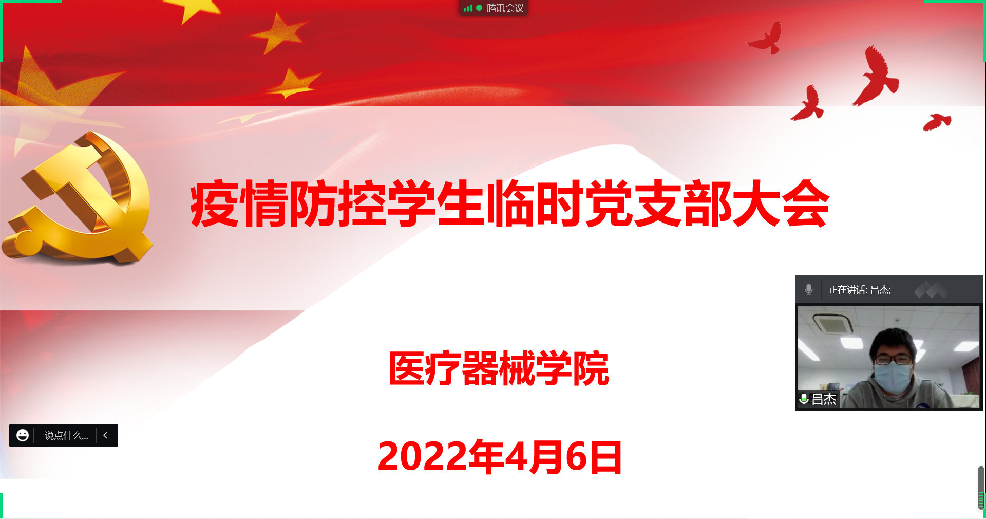会上,临时党支部书记吕杰老师进行了发言,他强调了临时党支部成立的背景和意义。当前上海疫情形式严峻,在校内的师生党员,不仅要守校,还要守人。守校,是将病毒拦截在校外,做到不点外卖,不翻越围墙外出,不接触未经消杀的快递等;守人,守的是校内的所有学生,保护好自己的同时,也要关注需要帮助的同学们,守护住每一位学生的身心健康。学院的临时党支部也正是为了这个共同的目标而成立,他希望学生党员利用自身的优势,协助开展好学院学生管理和服务工作。