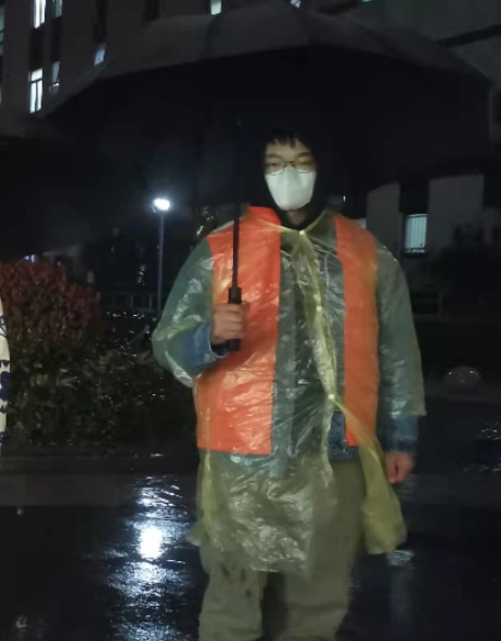 曹哲,在社区疫情防控中主要负责维持社区核酸检测现场秩序、解答居民相关问题、协助登记出示健康云二维码、上门进行排摸等工作,“请大家保持一米距离,提前准备好健康云二维码,必须要今天新生成的,有不会的来找我弄”,穿行在核酸检测的长龙前后,一天需要反复强调数十遍。天公不作美,降下了倾盆大雨,让她深刻地体会到了前线医务工作者的不易。