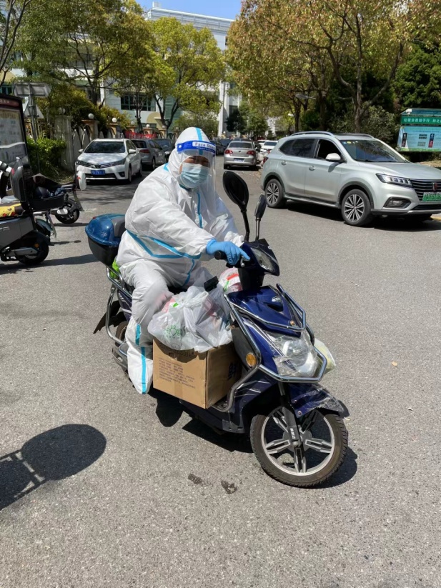 徐军老师,既是小区志愿者又是楼组志愿者,他的主要工作是进行快递分拣和发送,他骑着自己的电动车将外卖快递等物资从小区指定点送至各楼栋应收人,中午天气炎热,穿隔离服、佩戴护目镜和N95口罩,闷热对常人是一种熬煎,他克服各种不利因素,不喝水不上厕所,高效分发政府慰问物资和分配抗原试剂检测盒等物品,认真完成每项任务。