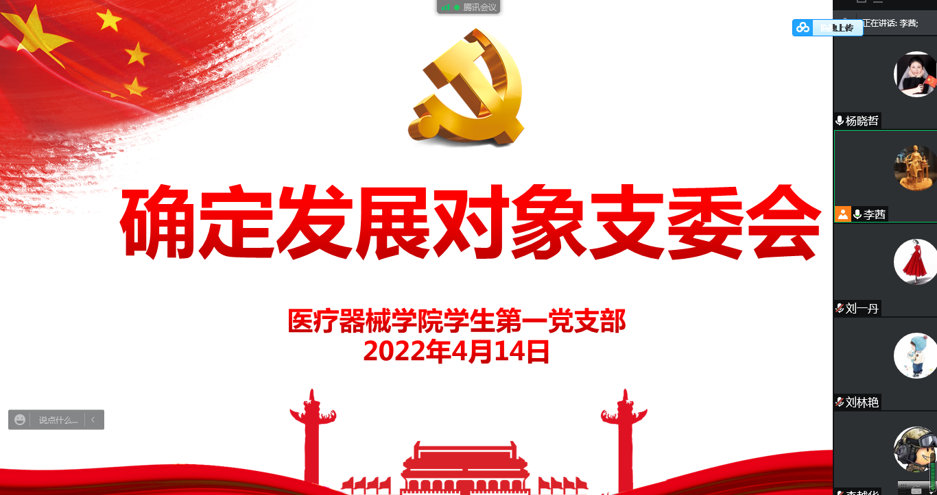 为进一步完善学生党员发展程序,提高党员队伍建设,增强党组织工作的透明度,保证党员发展质量,深入对入党积极分子的培养考察,使入党积极分子端正态度,为党组织培养合格后备人才成为发展对象。医疗器械学院学生第一党支部于4月16日晚在云端腾讯会议举行确定2022年上半年发展对象答辩会。支委会老师及35名入党积极分子参加了本次答辩。