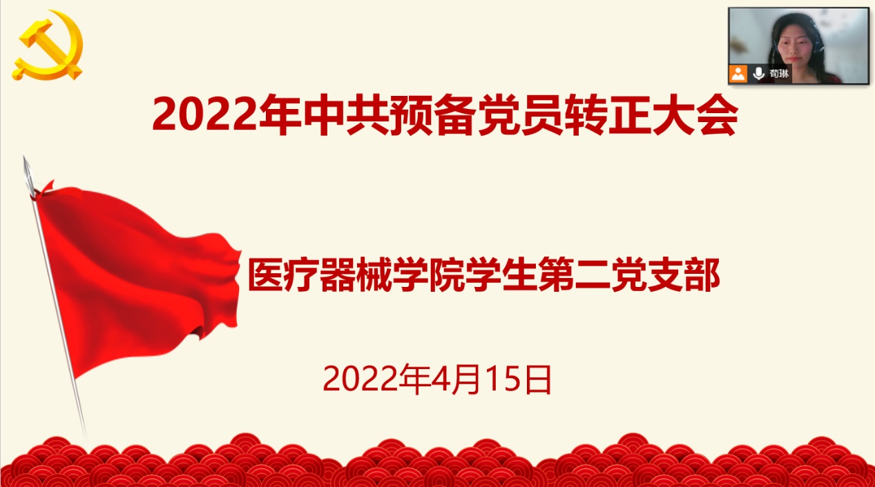 2022年4月15日下午18:00,医疗器械学院学生第二党支部通过腾讯会议在线召开中共预备党员转正大会。学生第二党支部全体党员、8名拟转正同志及其入党介绍人出席会议,会议由学生第二党支部荀琳同志主持。