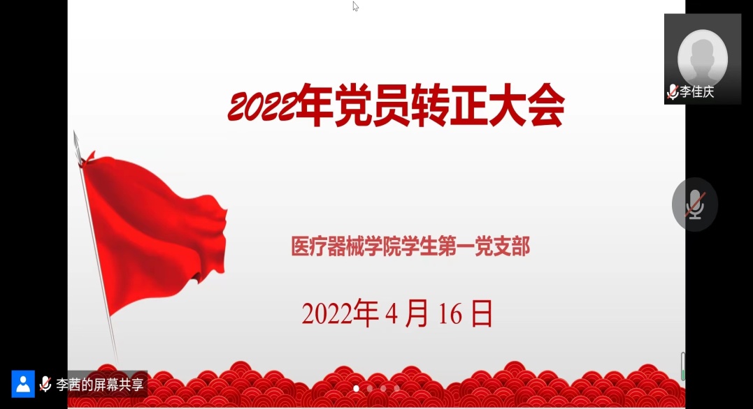 2022年4月16日下午18:00,医疗器械学院学生第一党支部通过腾讯会议在线召开中共预备党员转正大会。学生第一党支部全体党员、4名拟转正同志及其入党介绍人出席会议,会议由学生第一党支部李茜同志主持。