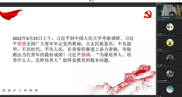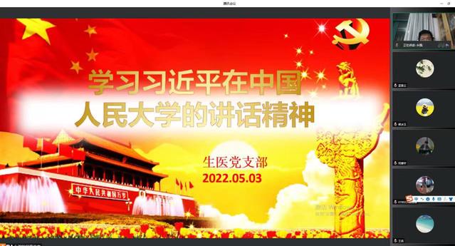 5月3日,晚上七点,医疗器械学院生医党支部在腾讯会议平台上就习近平总书记在中国人民大学发表重要讲话展开学习与交流,支部全体党员参加了这次活动。