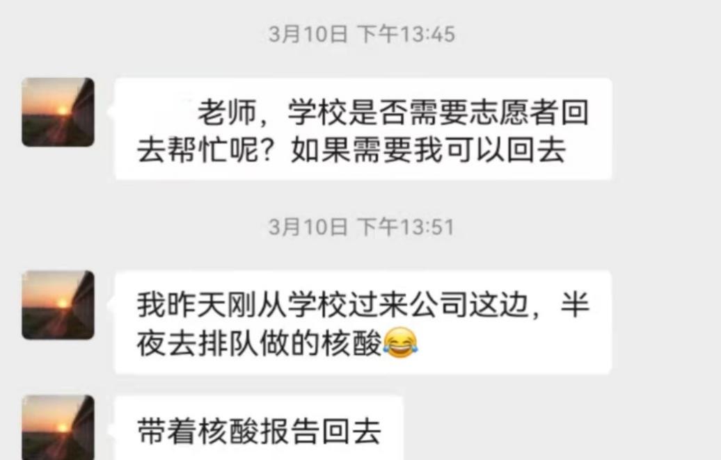作为一名学生党员以及毕业班学生,本在实习单位工作的张路安同学听闻学校需要疫情防控志愿者,毫不犹豫地和单位领导提出了申请,同时主动地向学校老师申请返校支援,在人民需要的时候挺身而出是一名党员义不容辞的责任。在学校疫情防控过程中担任了南苑保障组的组长,为其他防控小组提供物资(志愿者服装、口罩,饮用水等)以及人员上的支援,同时作为曾志愿者工作部部长,也与此次防控的南苑指挥交流了经验,在这几天的集中核酸检测中,不断优化流程,圆满完成了任务。