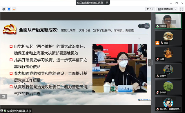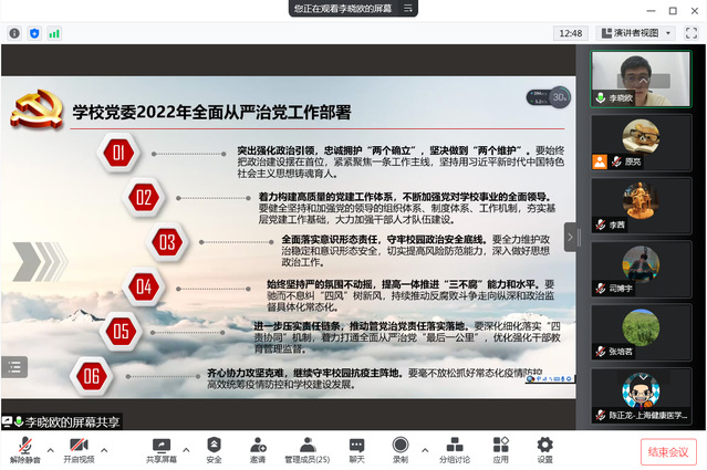 首先,李晓欧传达了学校2022年全面从严治党工作会议精神,重点传达了校党委郭永瑾书记围绕学校2022年全面从严治党工作提出的六个方面要求,“突出强化政治引领,忠诚拥护‘两个确立’,坚决做到‘两个维护’”、“着力构建高质量的党建工作体系,不断加强党对学校事业的全面领导”、“全面落实意识形态责任,守牢校园政治安全底线”、“始终坚持严的氛围不动摇,提高一体推进‘三不腐’能力和水平”、“进一步压实责任链条,推动管党治党责任落实落地”、“齐心协力攻坚克难,继续守牢校园抗疫主阵地”,并以吴韬校长提出的“提高政治站位,抓好学习贯彻”、“增强政治自觉,落实工作任务”、“强化政治担当,推动学校发展”等三点要求与全体党员共勉,充分发挥全面从严治党对学院人才培养、教育教学、科学研究、社会服务等各项工作的引领保障作用。