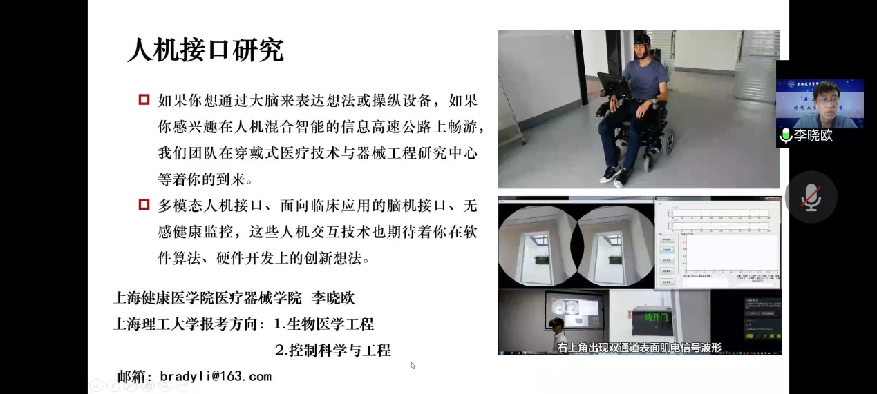 本次活动包括导师科研工作介绍、参会同学自我介绍及师生互动交流三个环节。首先,导师们通过视频、PPT等精彩纷呈的形式展示研究方向、研究成果以及毕业生去向等学生们关心的重点内容,涉及生物医学传感与检测、生物力学、生物材料、医用光学、健康大数据处理等多个领域。会场实时在线人数不断攀升,学生参会峰值人数达到45人。师生互动环节时,来自校内外的多名同学踊跃进行自我介绍,珍惜难得的机会,与导师们就考研、研究方向和内容等问题展开交流。本次分会场活动最终在气氛热烈的讨论中走向尾声,营员们纷纷表示收获颇丰,对研究生的学习生活有了更深刻的认识,更加坚定走上科研道路的决心。