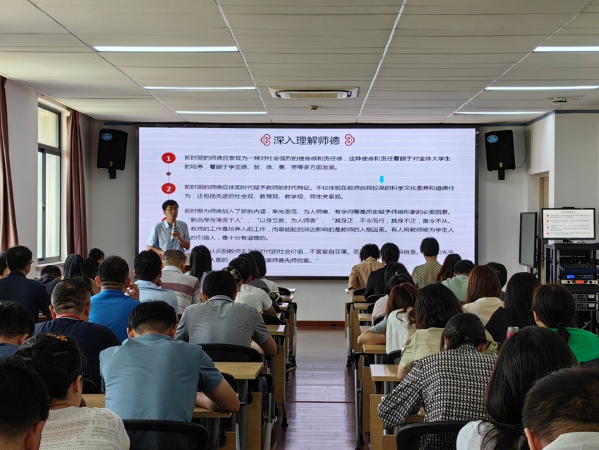 学院党总支开展教职工“开学第一课”专题教育。学院开展教职工“开学第一课”专题教育,学院党总支书记李晓欧领学习近平总书记2023年9月9日《致全国优秀教师代表的信》,希望全院教师弘扬“心有大我、至诚报国的理想信念,言为士则、行为世范的道德情操,启智润心、因材施教的育人智慧,勤学笃行、求是创新的躬耕态度,乐教爱生、甘于奉献的仁爱之心,胸怀天下、以文化人的弘道追求”这一中国特有的教育家精神,牢记为党育人、为国育才的初心使命,踔厉奋发,为强国建设做出自己的贡献。李晓欧带领全体教师再次深入理解师德,引导教师深刻认识到“师德应表现为一种对社会强烈的使命感和责任感,这种使命和责任着眼于对全体大学生的培养,着眼于学生德、智、体、美、劳等多方面发展”、“师德应体现时代赋予教师的时代特征,不仅体现在教师自我较高的科学文化素养和道德行为,还包括先进的社会观、教育观、教学观、师生关系观”,引导教师提高政治站位、增强“四个意识”,把握基本定位、增强底线意识。