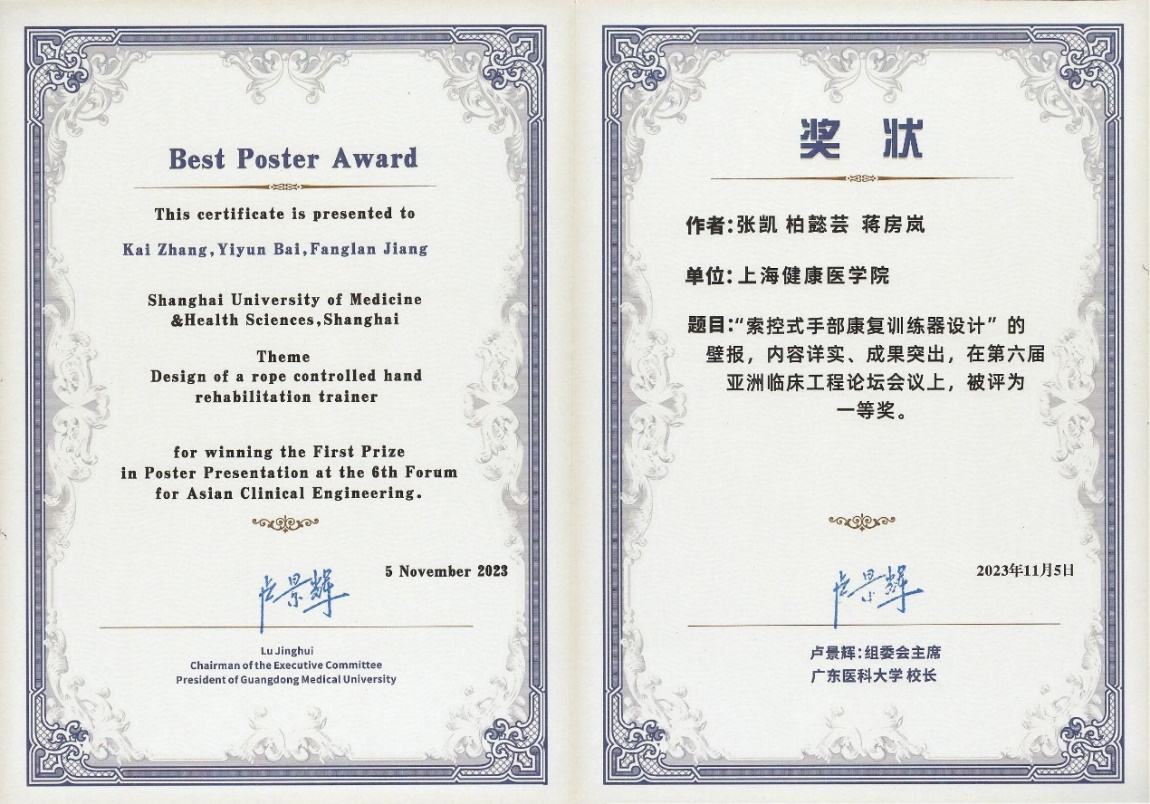 医疗器械学院派出两支代表队参加本次论坛壁报交流,经专家评议,壁报“索控式手部康复训练器设计”(学生:张凯,柏懿芸,蒋房岚)在亚洲各国57支参赛队伍中脱颖而出,荣获壁报展示一等奖,在国际舞台上展示了我院临床工程技术专业学生的专业素养。此次论坛共评选出五个一等奖。