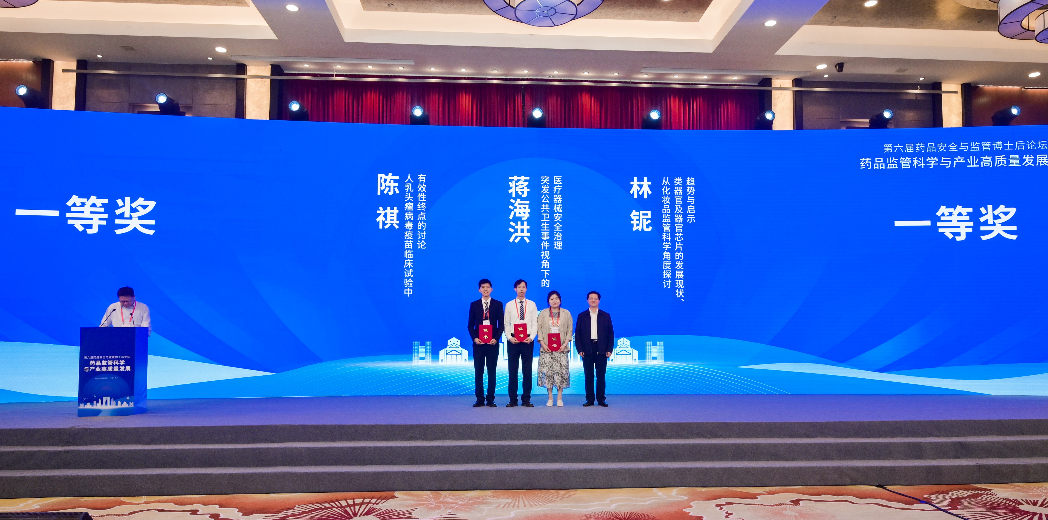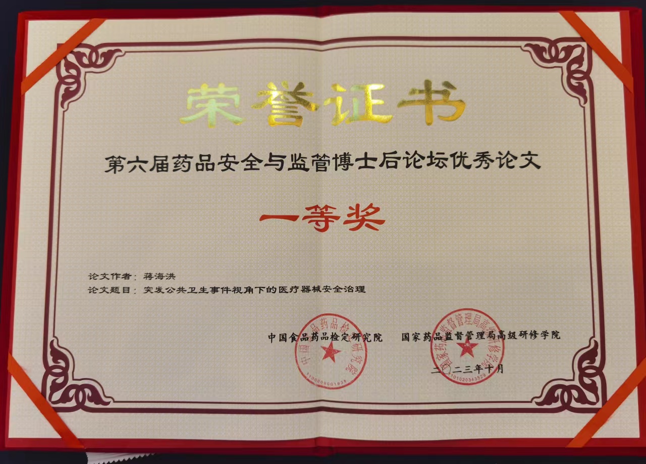 本届论坛共收到来自高等院校、监管部门和研究机构的博士或博士后撰写的论文102篇,盲审评出一等奖3名、二等奖6名、三等奖9名。我校医疗器械学院蒋海洪博士撰写的论文《突发公共卫生事件视角下的医疗器械安全治理》荣获一等奖,并受国家药监局雷平副局长为其亲自颁奖。