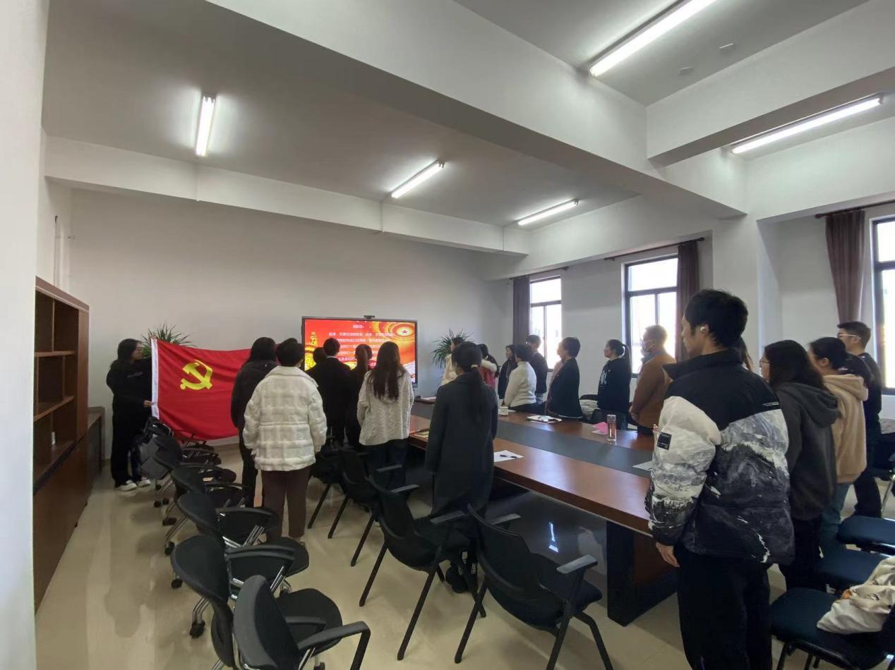 大会开始,全体起立奏唱国际歌。随后按照预备党员转正流程,支部对张翔宇、黄滢斐、宋如意共3名预备党员逐一展开讨论。首先,预备党员本人宣读《转正申请书》;其次,分别由两位入党介绍人向大会介绍预备党员的有关情况,并对其能否转正表明各自意见;接着,组织委员刘林艳同志代表支委会向大会报告预备党员现实表现的考察情况、征求党员群众意见情况及公示情况;与会党员同志对3名预备党员能否转正逐一进行充分讨论,纷纷发表意见;最后,经支部正式党员无记名投票表决,大会同意支部3名预备党员正式转为中共党员。支部决议宣布完,3名同志再次向大会表态,同时承诺会改进缺点、不断完善自身,进一步发挥先锋模范作用。
