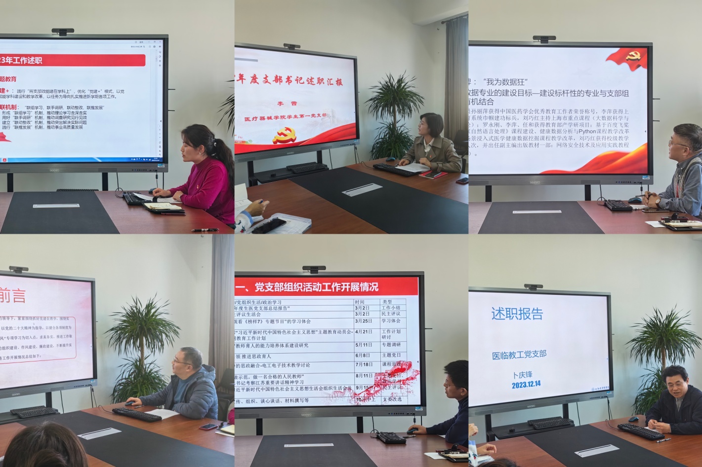 述职评议会上,学生第二党支部荀琳书记、实训教工党支部商怀超书记、学生第一党支部李茜书记、生医教工党支部陈永强书记、信息教工党支部罗永刚书记和医临教工党支部卜庆锋书记依次分别围绕学习贯彻习近平新时代中国特色社会主义思想主题教育、党员教育管理、党组织生活、支部品牌建设、本科教学工作合格评估期间党支部和党员作用发挥等党支部2023年党建工作进行汇报,六位党支部书记在认真总结本年度落实履行职责情况的基础上,深入查摆现存问题,逐一对工作中的短板进行梳理,并对2024年度党支部工作提出了改进目标。