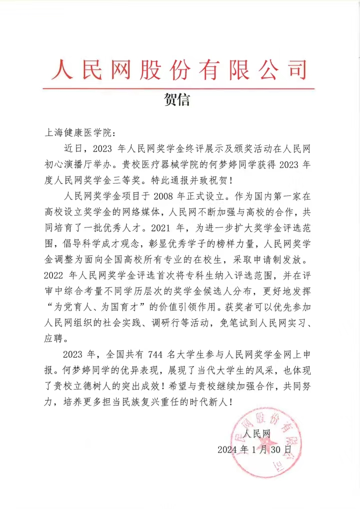 2024年1月23日,2023年人民网奖学金终评展示及颁奖活动在北京人民日报社新媒体大厦举办。活动现场公布了2023年人民网奖学金一、二、三等奖的获奖名单,上海健康医学院医疗器械学院2021级数据科学与大数据技术专业学生何梦婷荣获人民网奖学金三等奖,是我校学子首次获此荣誉。
