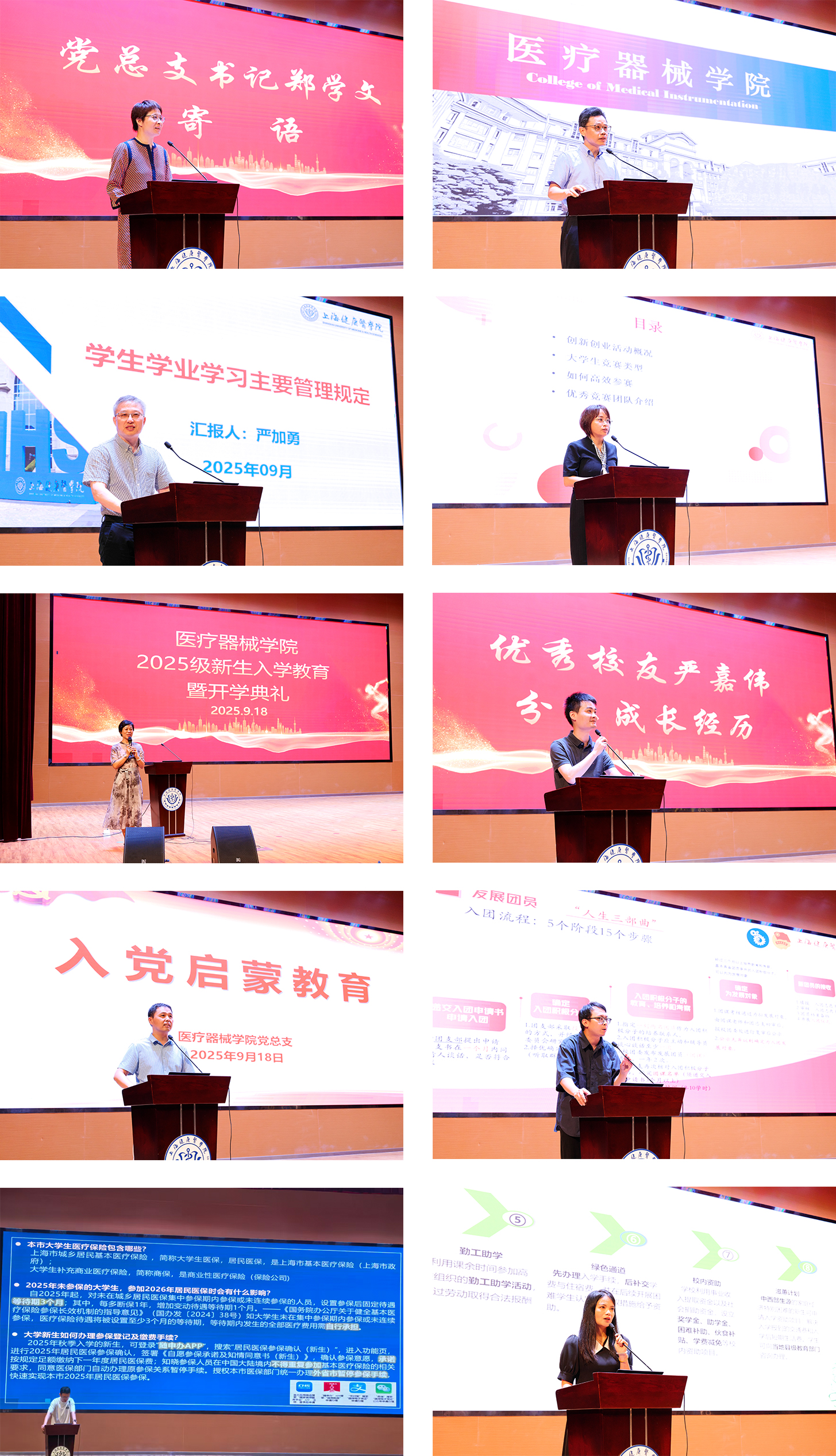 9月18日上午,学院2025级新生入学教育暨开学典礼在东苑800人报告厅隆重举行。全体院领导、专业主任、新入职教师、优秀校友代表、新生辅导员等参加开学典礼。会议由党总支副书记杨美主持。党总支书记郑学文提出磨砺品行,保持身心健康;敢于吃苦,练就过硬本领;勇于挑战,增强创新能力三点寄语。院长杨晖介绍学院人才培养的目标定位、主要路径等整体情况。副院长严加勇、李萍、副书记杨美分别就学业、创新创业、学生管理作了宣教。优秀校友2011级医疗器械检测技术及应用专业严嘉伟分享个人成长发展体会与经验。学院专职组织员原亮和团总支书记陈金杜分别做了入党启蒙教育和团支部工作介绍。学院学工办主任王海峰和资助专员张夏静分别介绍了相关事务工作。