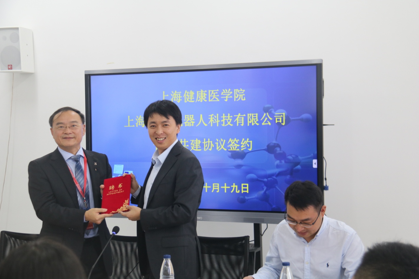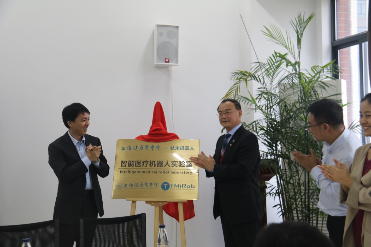 协议签署会议由医疗器械学院党总支王云光书记主持,医疗器械学院李晓欧副院长首先介绍了我校与钛米公司合作的背景,钛米公司是一家针对高端服务机器人市场提供产品和解决方案的公司,拥有十多项机器人发明专利,在智能机器人控制理论、多传感器融合、人机交互、系统集成等研究和产品化方向等方面有一定的科研实力,学院与钛米公司合作,可以提高教师的科研能力,促进学院的专业建设。接着,双方签署合作协议、为合作成立的“智能医疗机器人实验室”揭牌、颁发聘书,钛米公司董事长希望双方在智能医疗机器人研发方面加强合作、共享资源。最后,黄校长在科研平台推进、相关专业设置、学生创新能力培养、智慧医疗产教融合发展等四个方面对医疗器械学院提出要求,希望医疗器械学院一要凝聚方向,快速锁定智慧医疗器械、智能机器人方向,二要打造品牌,凝聚更多的相关企业、更好的人才储备,带动学校的发展和学生的成长,紧密联系社会,开拓更大的合作平台,三要成立新专业,培养智慧医疗器械、智能医疗机器人人才,四要产生一些成果,服务于健康,为智慧健康的打造做贡献。