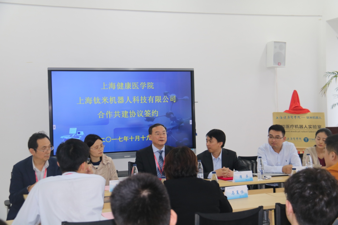 10月19日下午,我校与上海钛米机器人科技有限公司签署合作协议会议在医疗器械学院会议室进行,学校黄钢校长、钛米机器人科技有限公司潘晶董事长(以下简称钛米公司)、校科技处、医疗器械学院、钛米公司等相关人员参加了此次会议。