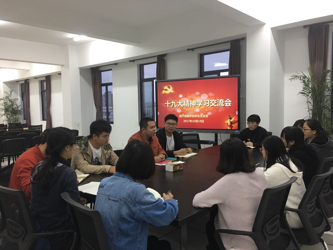 10月19日晚17:00,医疗器械学院学生党支部学习领会党的十九大精神第一阶段交流会在新南苑506会议室举行,在校的支部教师党员、学生党员共12人参加了集中学习交流,学生党支部书记叶剑辉主持了会议。