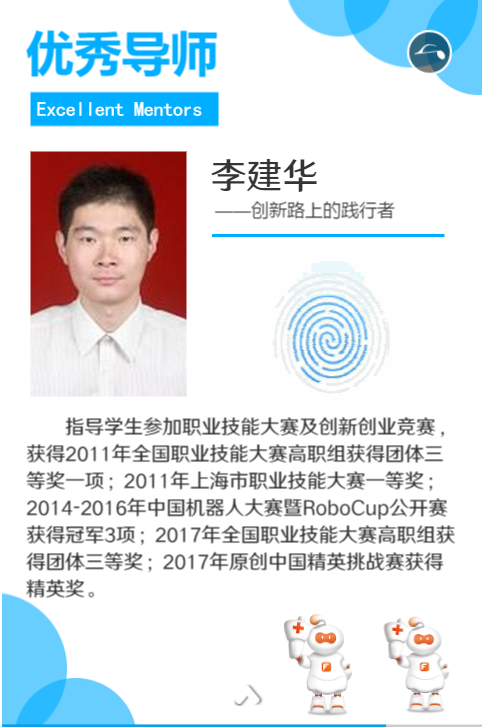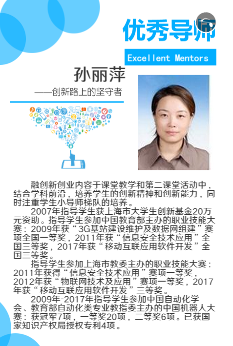 “新工科”人才培养的根本是培养学生的创新思维、创新能力和创业精神。信息支部的教师在人才培养中积极发挥了教育引导和指导帮扶的作用,注重学生的创新精神、创业意识和创新创业能力的培养,结合学科前沿,将创新创业内容融合于课堂教学和第二课堂活动中。由孙丽萍院长带领的信息支部教师团队指导的学生创新团队多次在中国机器人大赛上荣获冠军,各类全国职业院校技能竞赛中获取奖项。孙丽萍老师和李建华老师入选全国万名创新创业导师的殊荣。