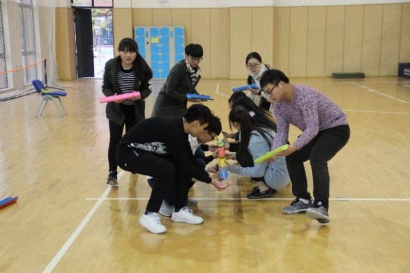 活动的开始是进行总团队破冰,欢快的破冰游戏瞬间点燃了同学们的激情,紧接着每组成员在组长的带领下分别展示了各自的队名、口号以及队形。团队破冰结束后,素质拓展活动正式开始。主要包括四个项目:不倒森林、能量传递、击鼓颠球以及快乐击掌。这四个项目都经过教练精心设计,专门提升团队合作能力,分别考验的是大家的反应力、平衡力、团体协作能力。