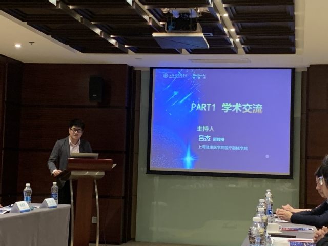 医疗器械学院党总支书记、副院长李晓欧,党总支副书记吕杰,医疗产品管理教研室主任蒋海洪和张培茗老师参加了会议,会议由吕杰副教授主持。首先李晓欧教授致欢迎词,他主要介绍了本次会议的背景、学校的基本情况以及我校上海穿戴式医疗器械工程研究中心的建设情况。张培茗副教授做了题为“穿戴式医疗器械现状与发展趋势研究”的主题报告。