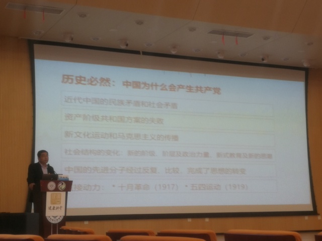 罗博士从3月19日中美阿拉斯加州安克雷奇高层战略对话切入,用生动的党史故事和图片视频资料,从中国共产党成立的历史背景、中国共产党一大召开的过程和成果、中国共产党一大代表的人生谢幕和中国共产党的建党精神及其启示等四个方面深入浅出地介绍了中共一大召开的背景、过程和历史意义。“近代中国的民族矛盾和社会矛盾”、“资产阶级共和国方案的失败”、“新文化运动和马克思主义的传播”、“五四运动与南陈北李相约建党”、“中共一大会议的筹备、召开过程、会议通过文件、会议中的争论”,这些历史片段使我们充分认识到中国共产党的成立并不容易,中国共产党从成立始就有深沉的使命责任意识和强烈的历史担当精神。党的第一次全国代表大会正式宣告了中国共产党的诞生,这是中国历史上开天辟地的大事件,从此,中国共产党开始为民族独立、国家富强和人民幸福进行艰苦卓绝的奋斗。最后,罗博士用李大钊先生的话“黄金时代,不在我们背后,乃在我们面前;不在过去,乃在将来”与师生共勉,希望师生不负伟大时代,努力拼搏,书写人生华章。