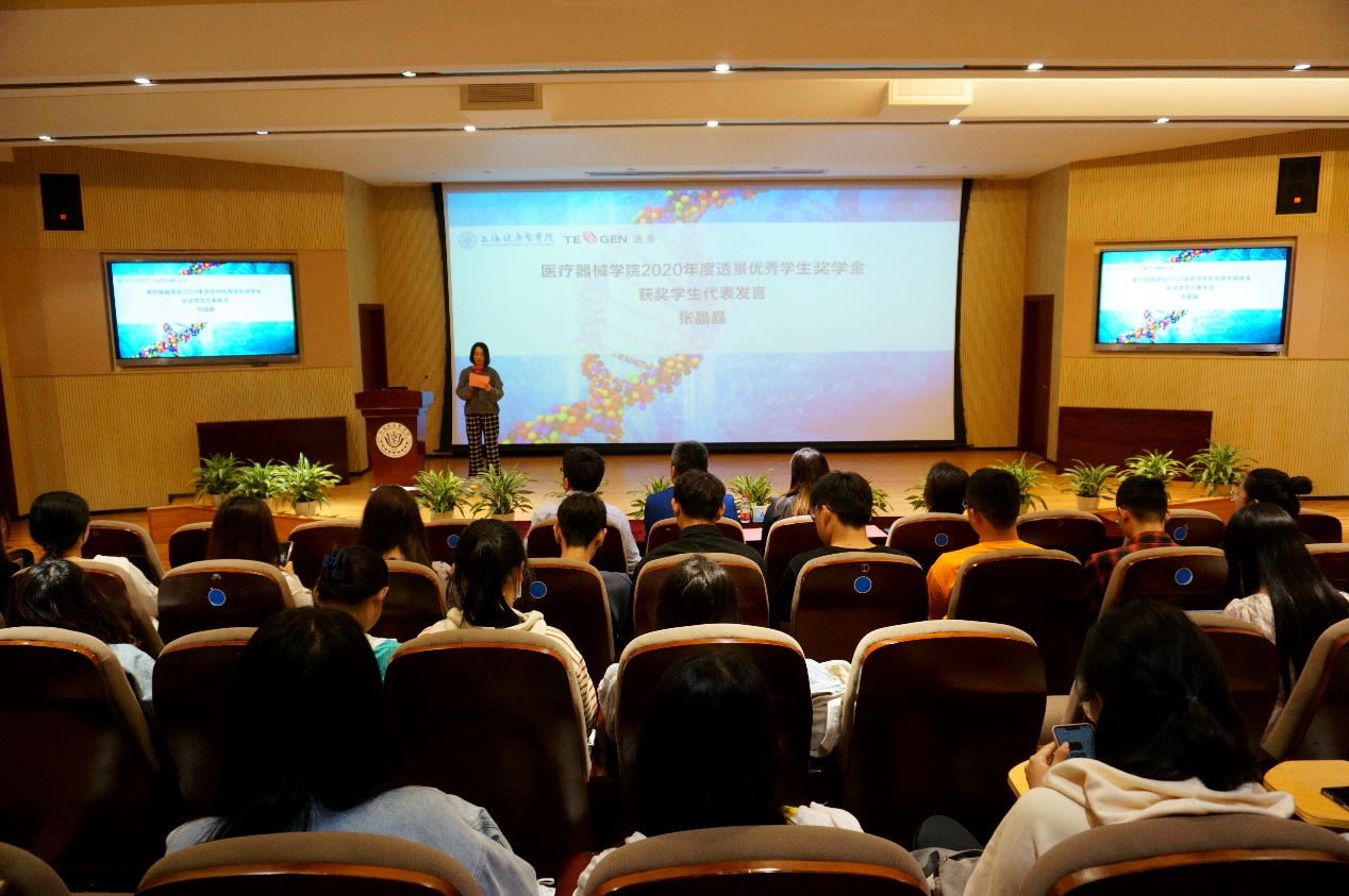 首先由孙丽萍老师宣读2020年度“透景优秀学生奖学金”获奖名单,吕杰老师宣读2020年度“透景优秀教师奖”获奖名单,上海透景生命科技有限公司的嘉宾与学院领导一起向获奖同学及获奖教师颁发荣誉证书。随后,获奖学生代表张晶晶同学发表获奖感言。张晶晶同学深感上海透景生命科技有限公司为我校学子提供了广阔的学习平台,促进我院学生医疗应用技能的不断提升,同时表示同学们要感恩并珍惜上海透景生命科技有限公司为莘莘学子提供的良好学习条件,努力成为受企业欢迎的创新型高素质人才。上海透景生命科技有限公司应用工程部总监张晓峰介绍了公司发展的现状,以我校毕业生在上海透景生命科技有限公司的良好发展勉励在场学生,希望同学们可以到上海透景生命科技有限公司实现自己的梦想,为发展祖国的医疗事业,做出自己的贡献。最后,医疗器械学院党总支副书记吕杰老师则代表学院感谢上海透景生命科技有限公司坚持给予优秀师生的经济帮助和人文关怀,表达了对上海透景生命科技有限公司致力于为人类健康做出更大贡献的美好愿景和企业社会责任的崇高敬意。吕书记向透景公司的嘉宾介绍了学院如今的快速发展及丰硕成果,也希望在今后的工作中能开展更多的合作。(医疗器械学院)
