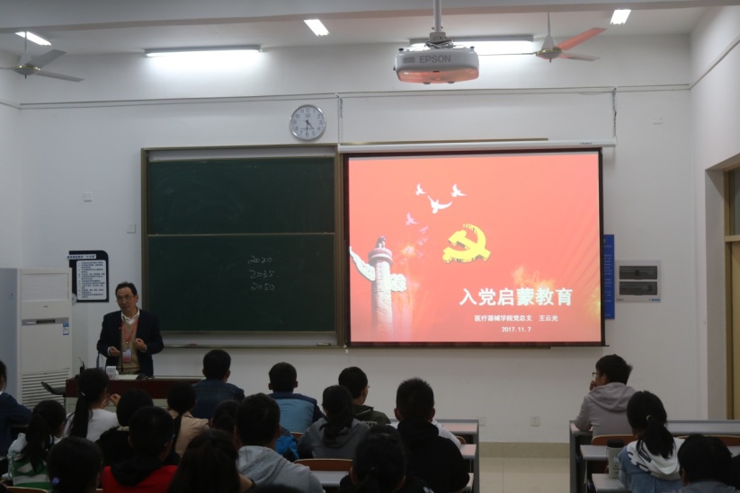 11月7日下午,医疗器械学院党总支书记王云光在新南苑北区103教室为2017级新生开展了入党启蒙教育专题讲座,有120名各班级新生代表到场聆听了讲座。